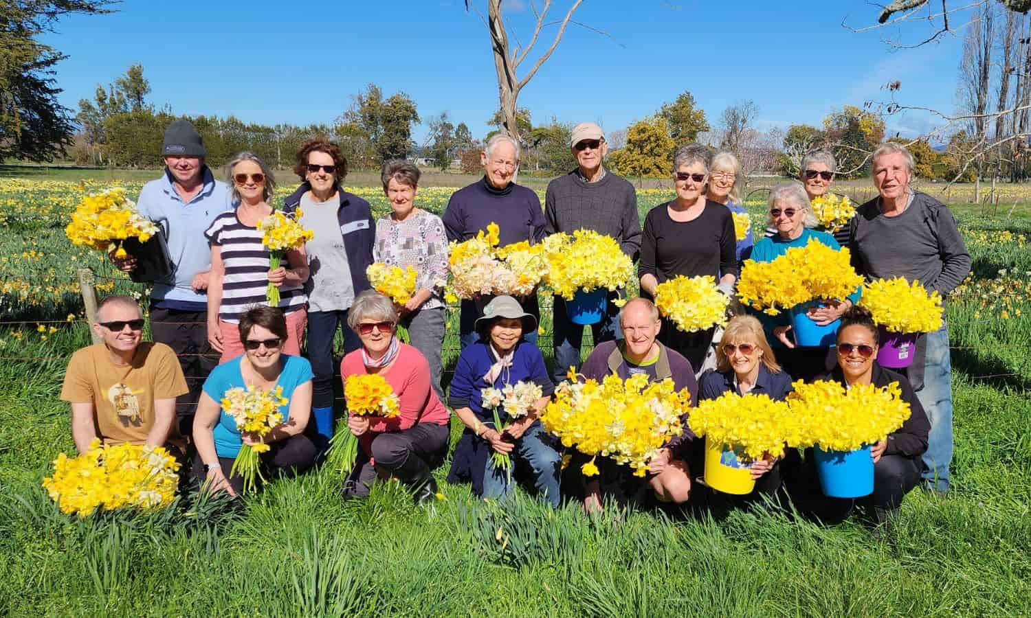 Our incredible team of 16 volunteers (Monique, Bill, Richard, Lyn, Jim, Sandra, Paul, Eva, Mary, Gayle, Pam and Sue – did I miss anyone out?) alongside Simon, Wendy, Fe, and Eugene from ANZ Bank, made today’s efforts truly remarkable. Your hard work and enthusiasm ensured we gathered a stunning array of blooms. We couldn’t have done it without you, thank you for your outstanding support! Now, we’re all set for a day of bunching tomorrow, getting everything ready for Daffodil Day on Friday!