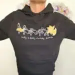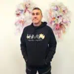 20% Polyester. 80% Cotton. Hoodie – Unisex style.  Warm and cosy, with Kangaroo pocket style. (Sarah our model is wearing a Size XS – Aaron is wearing a Size M)
