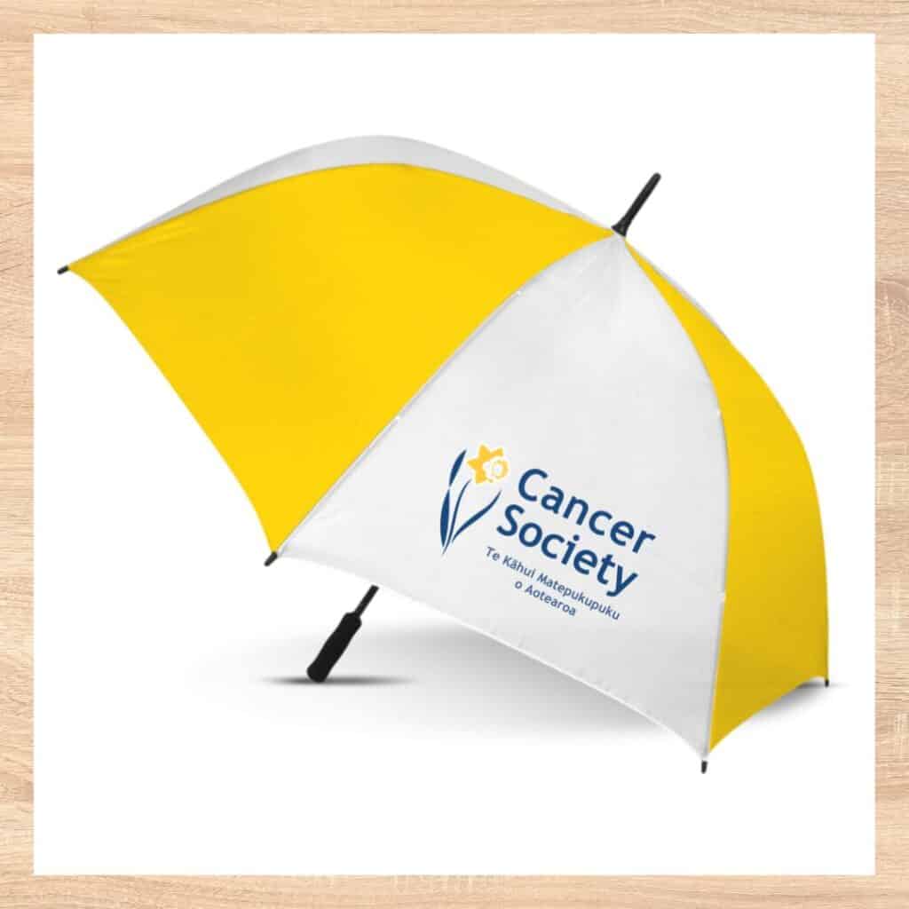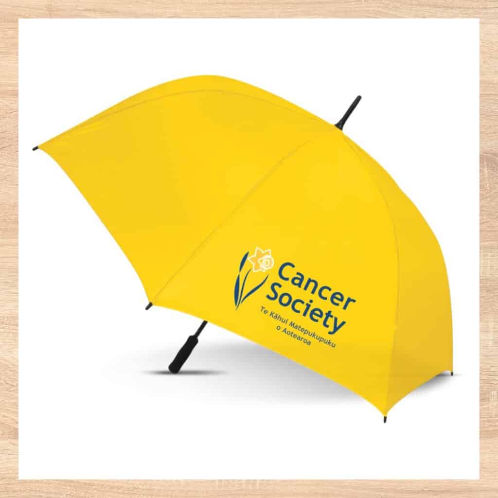 Cancer Society branded premium automatic opening, eight-panel sports umbrella with a strong 190T showerproof polyester canopy which has 76cm ribs. It has a windproof eight-rib fibreglass frame and a fibreglass shaft with a soft EVA hand grip.